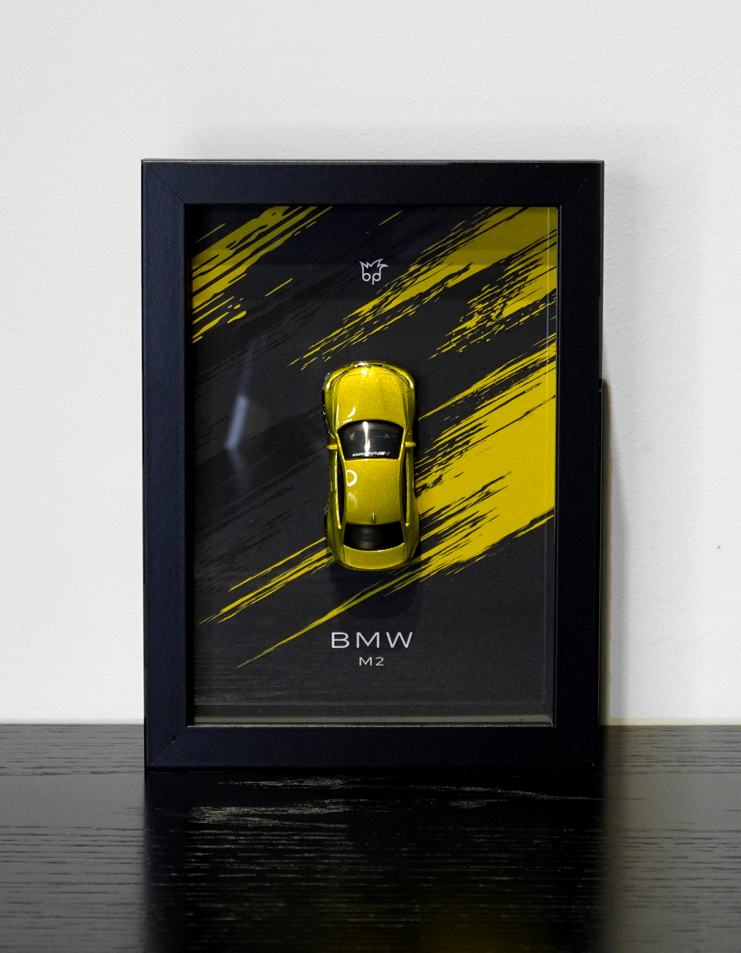 Ramka BMW M2 Gold z 2016 roku to elegancka dekoracja 3D dla fanów bawarskiej motoryzacji, hot-hatchy o sportowym charakterze i kolekcjonerów modeli diecast. Idealna jako prezent albo stylowy akcent do biura, pokoju lub garażu.