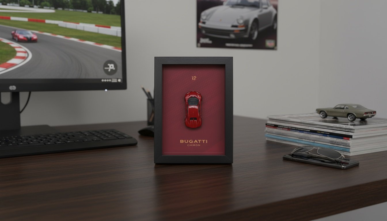 Ramka Bugatti Chiron z modelem Hot Wheels to wyjątkowa dekoracja 3D, która łączy luksus, prędkość i perfekcyjną inżynierię. Idealna dla fanów supersamochodów, kolekcjonerów Hot Wheels i miłośników marki Bugatti.