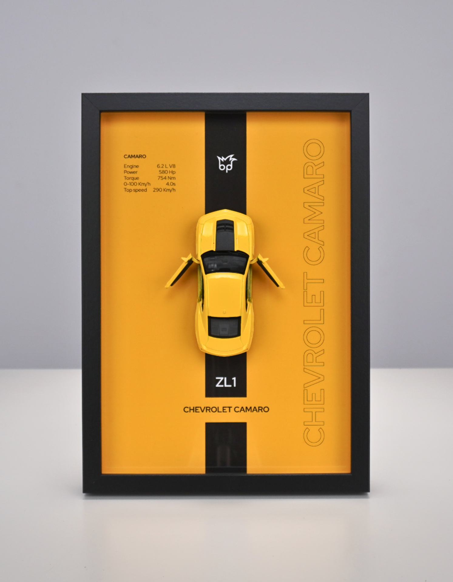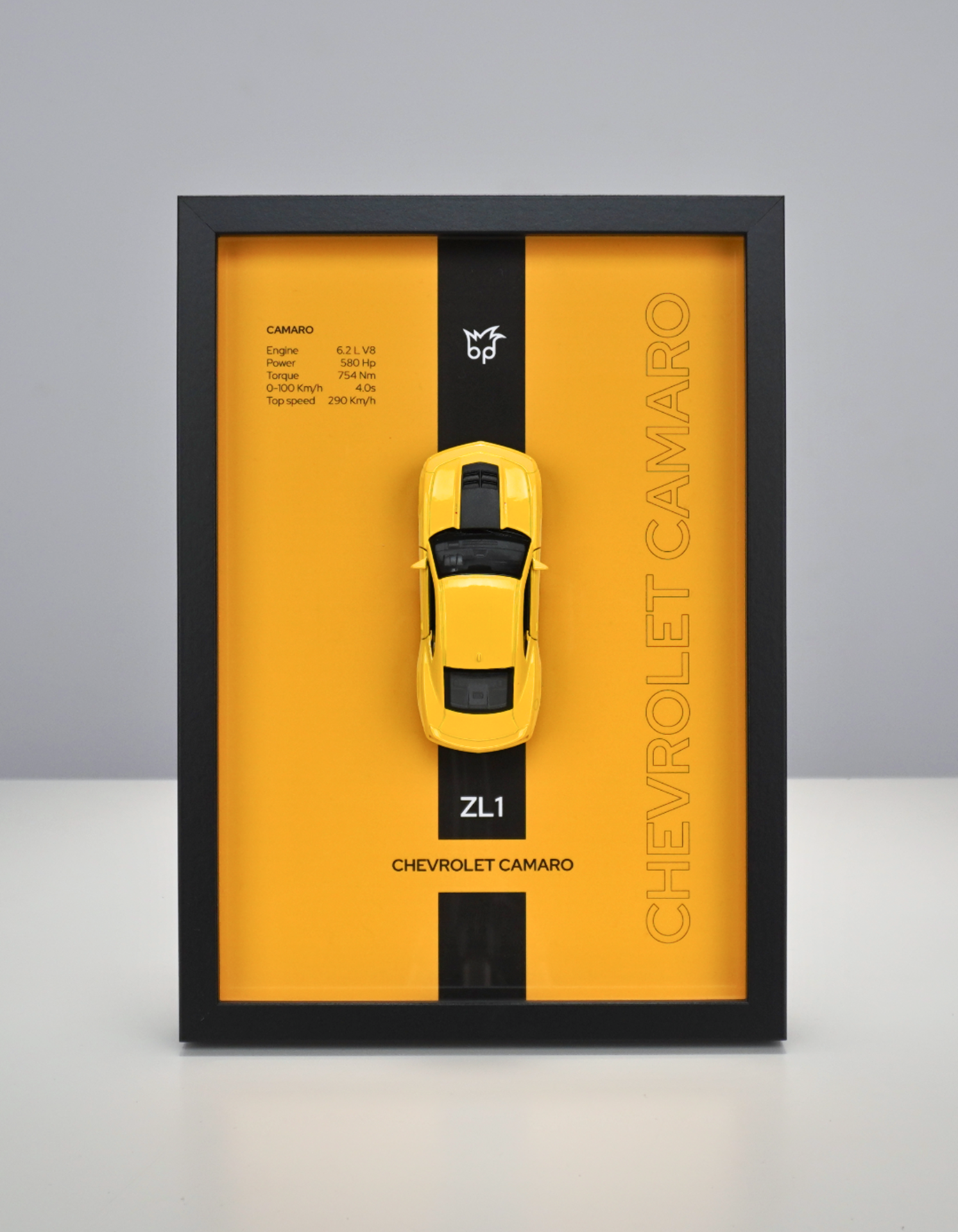 Chevrolet Camaro ZL1 to legenda szos – symbol potęgi, prędkości i precyzyjnego prowadzenia. Ramka z jego modelem oddaje ducha klasycznego amerykańskiego muscle car w ekskluzywnej formie dekoracyjnej.