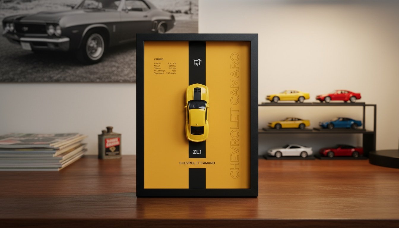 Ramka Chevrolet Camaro ZL1 w żółto-czarnym wydaniu to hołd dla amerykańskiej mocy i klasycznego stylu muscle car. Idealna dla fanów motoryzacji, kolekcjonerów Hot Wheels i miłośników legendarnego V8.