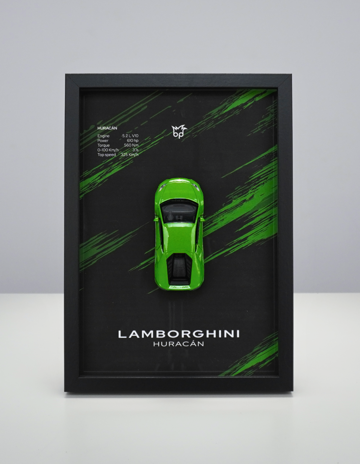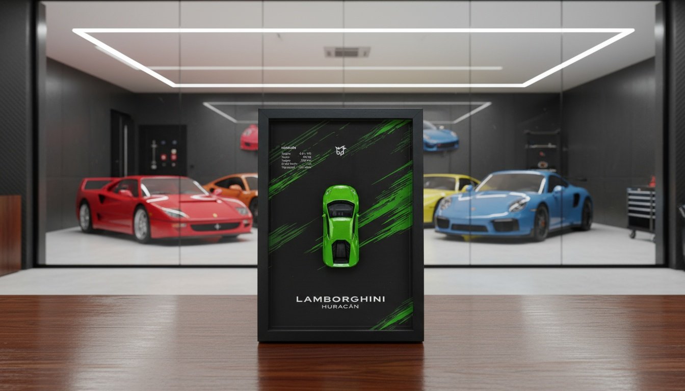 Ramka Lamborghini Huracán w zielonym kolorze Verde Mantis to wyjątkowa dekoracja 3D, która łączy włoską elegancję i ekstremalną moc. Idealna dla fanów Lamborghini, kolekcjonerów Hot Wheels i miłośników supersamochodów.