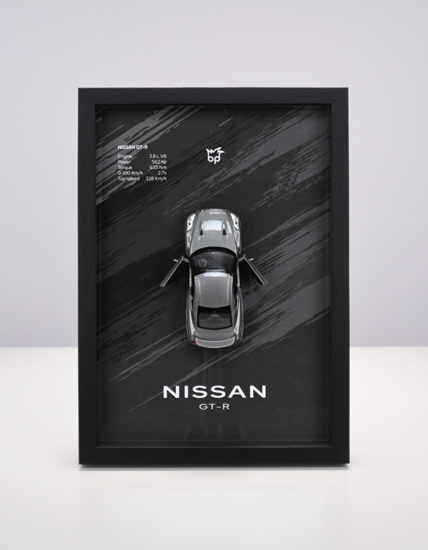 Nissan GT-R, znany jako “Godzilla”, to symbol osiągów, precyzji i inżynierii najwyższej klasy. Ramka z jego modelem oddaje ducha jednego z najszybszych samochodów sportowych Japonii.